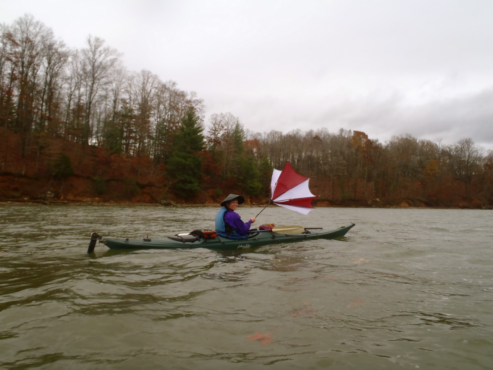 Thus far, the most significant factor determining our speed has been the wind. We think the maximum wind speed we've experienced is about 20 mph. These speeds force us to choose protected shoreline routes rather than open water crossings to cut corners. When we have a tailwind, we bust out our Fiberglass Shaft umbrellas to sail. Liddell is a conservative umbrella sailor while Kara goes balls-to-the-wall and sometimes experiences umbrella blowout at great speeds.